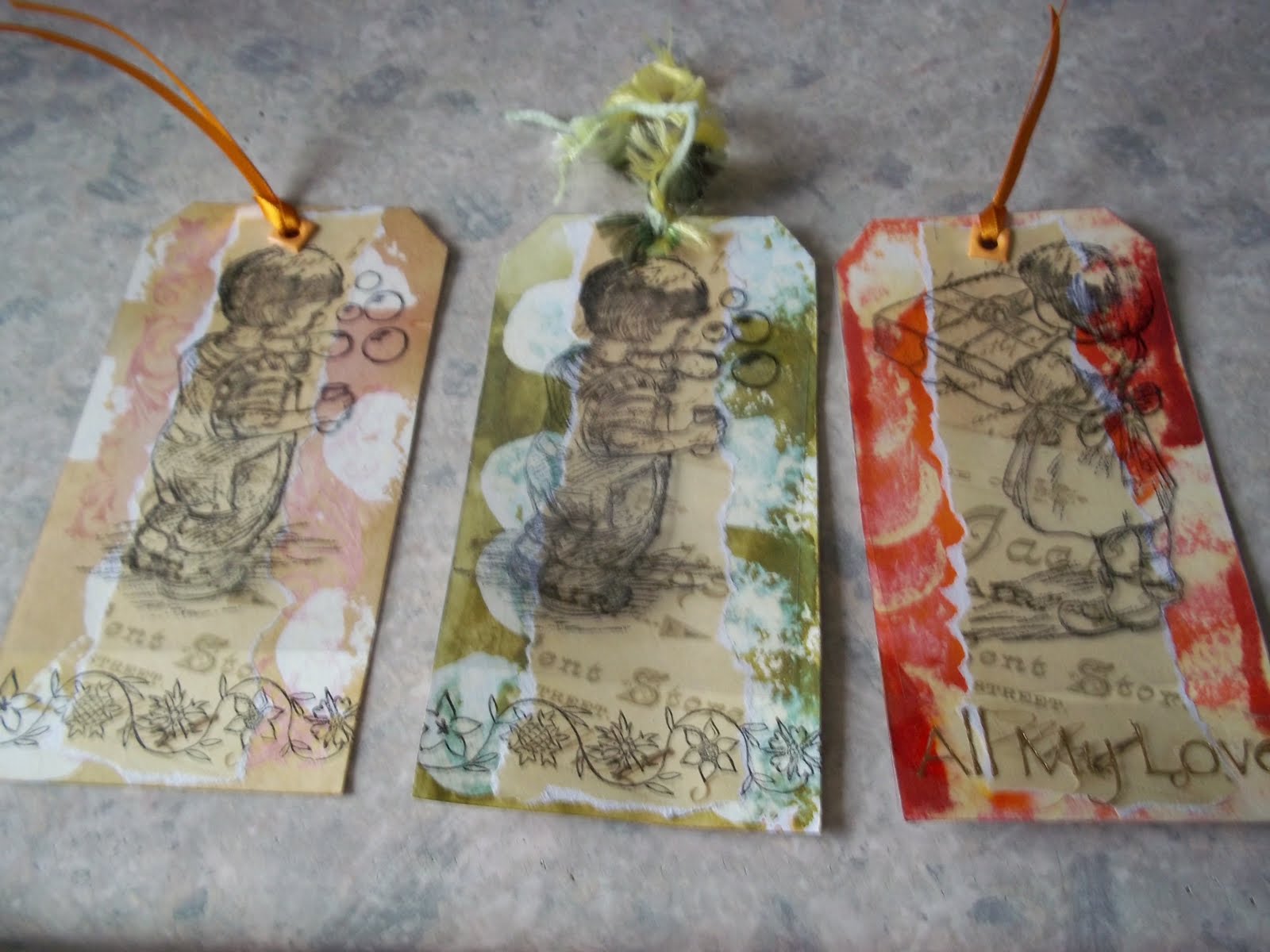The background of my tags is done using bleach,then i added a torn strip of letter paper down the middle.